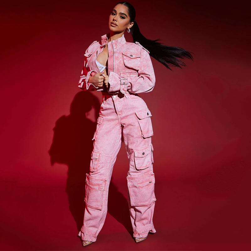 Pantalon cargo personnalisé pour femmes Ensemble 2 pièces Veste en jean courte Ensemble jeans baggy Ensemble denim deux pièces pour femmes