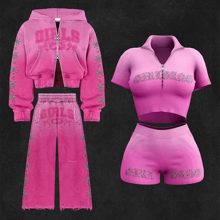 Ensemble de survêtement personnalisé pour femmes avec sweat à capuche court zippé et strass, 400 g/m², personnalisable