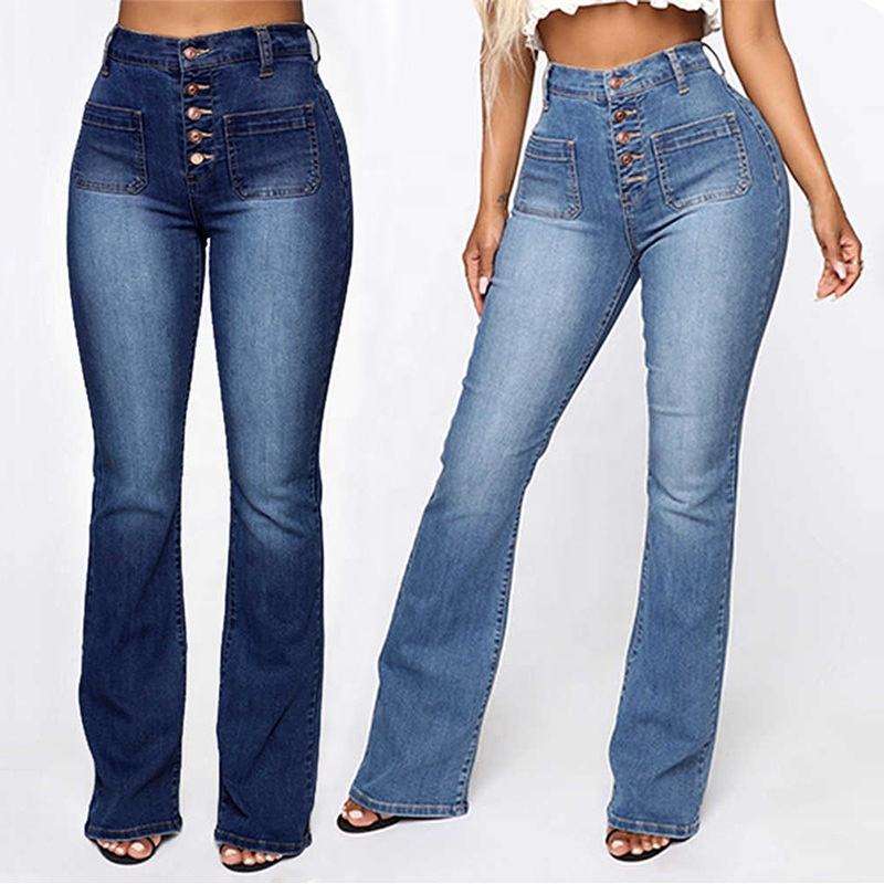 Jean en denim personnalisé pour femme, taille haute, à empiècements, non extensible, avec fermeture éclair avant et arrière, coupe évasée