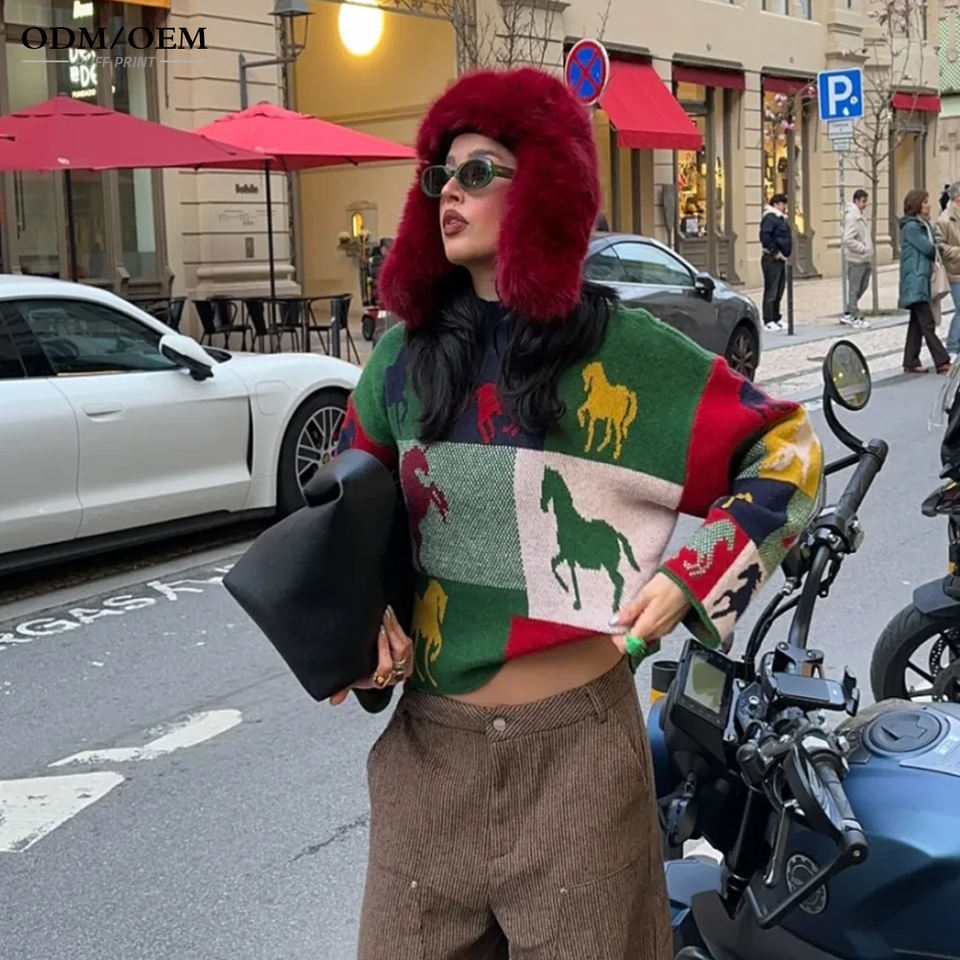 Pull Jacquard Personnalisé pour Femme, Motif Cheval Animalier Color Block, Tricot Oversize, Chandail en Maille