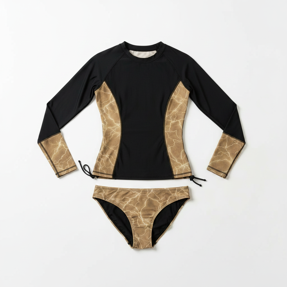 Ensemble de maillot de bain rashguard personnalisé pour femme, haut à manches longues avec empiècements contrastants, bas de bikini imprimé sur le côté