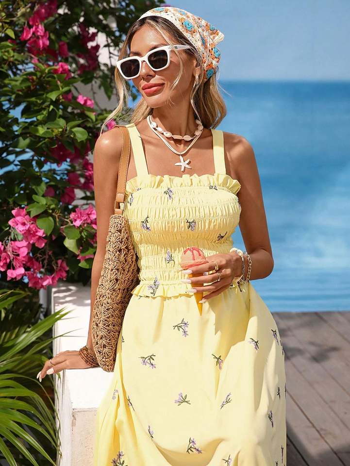 Custom Women's 100% Cotton Woven U Neck Batwing No Selves Smocked Waist Maxi Casual Flowy Dress for Daily Party Office