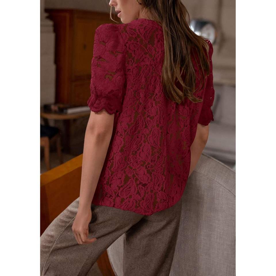 Chemisiers habillés décontractés pour femmes sur mesure, printemps 2025, chemisiers à œillets, col rond, boutons, manches courtes bouffantes, hauts en dentelle, taille XL
