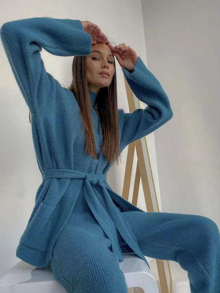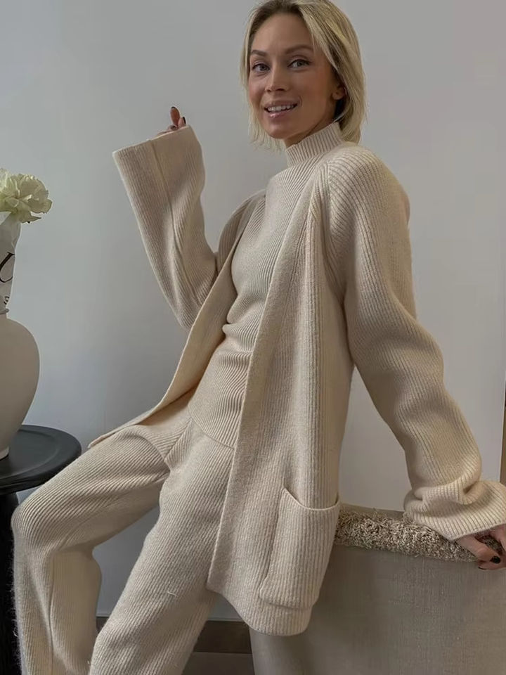 Ensembles de cardigan de pull de laine et cachemire d'automne-hiver pour femmes personnalisées surdimensionnés tricotés pantalons longs à col roulé de 3 pièces décontractés sur le devant