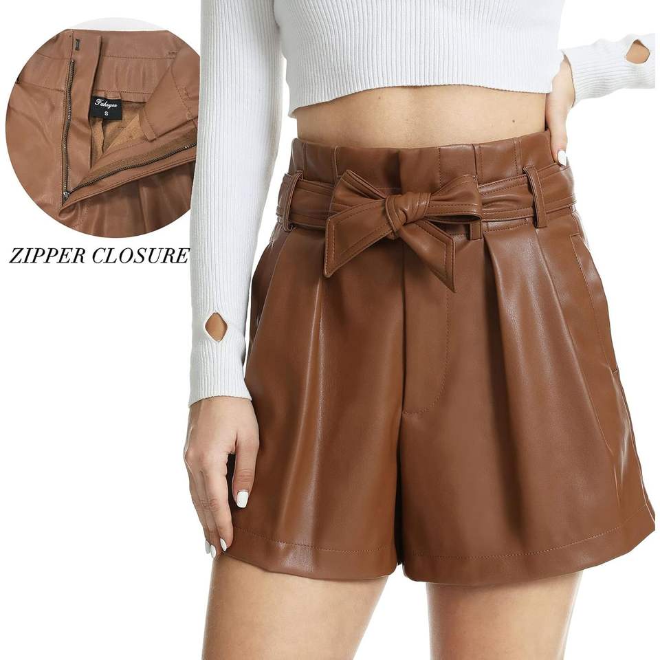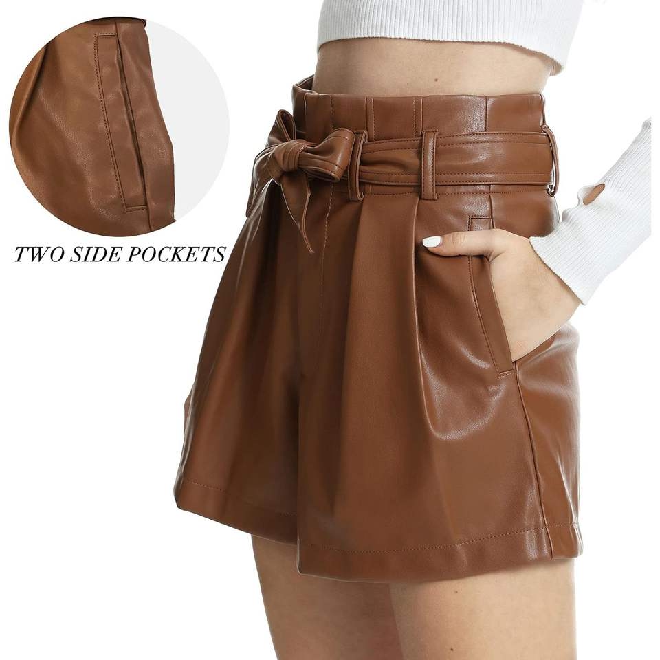 Custom Women's Black Faux Leather High Waisted Casual Shorts Size S-XXL Wide Leg Hot Bermuda Pattern Cotton Fabric