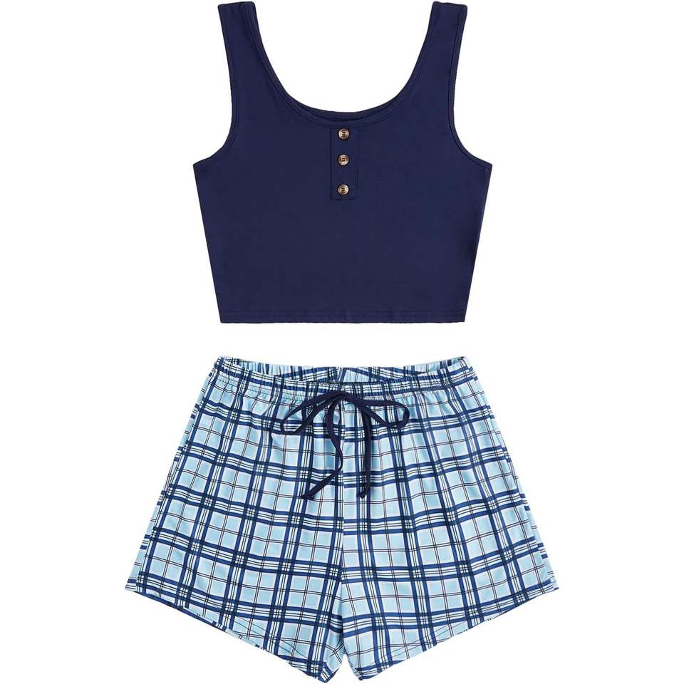 Ensemble pyjama décontracté pour femme : débardeur boutonné et short à carreaux, en maille douce, deux pièces