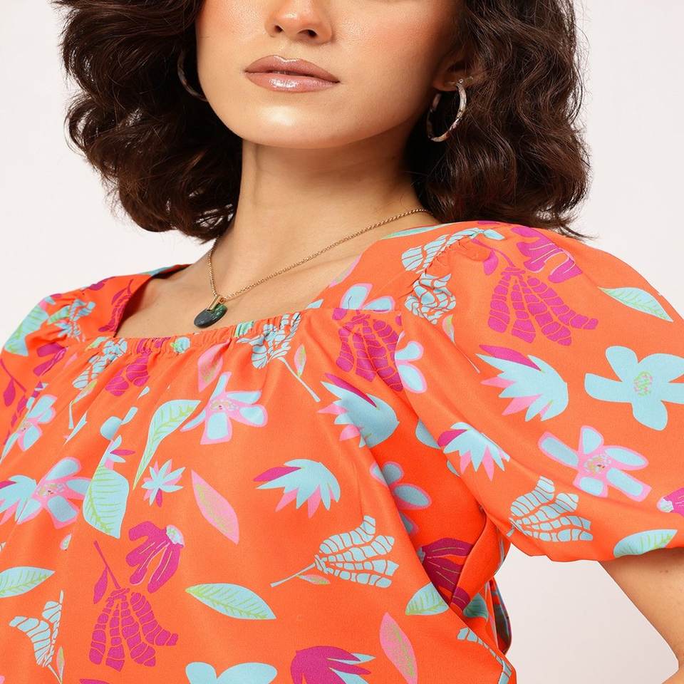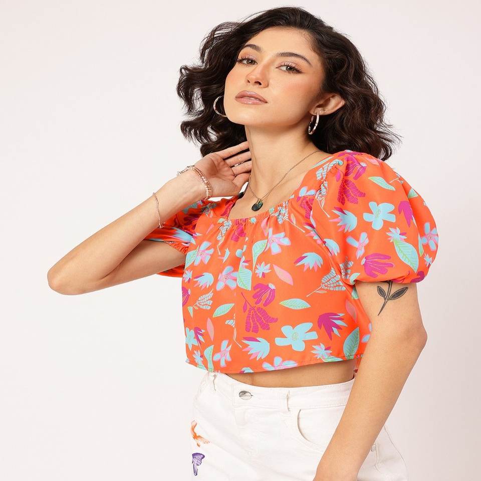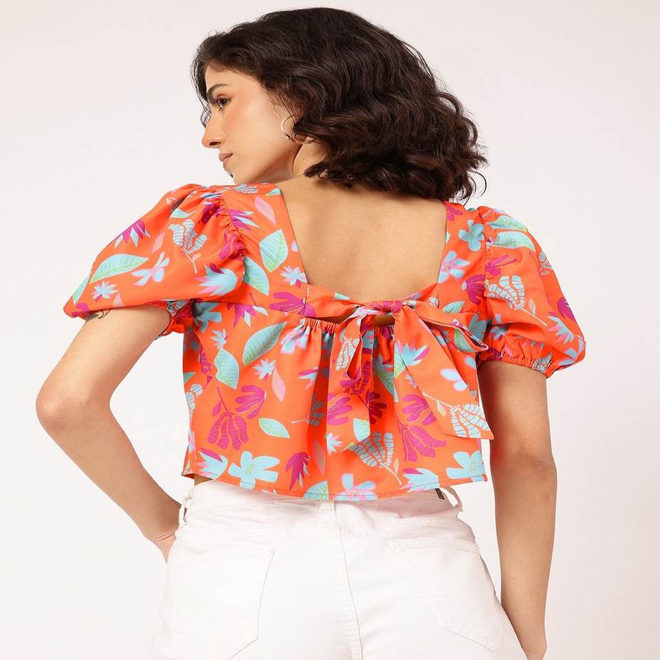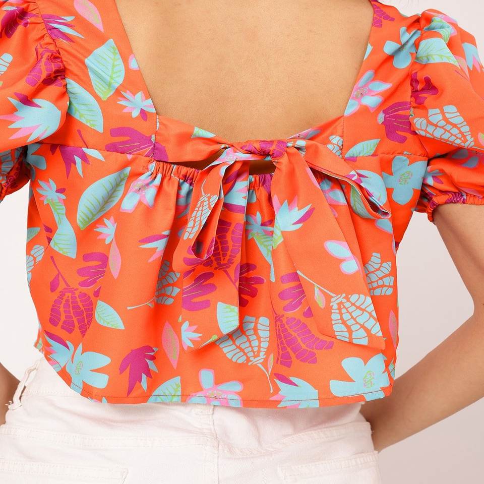 Haut court personnalisé à imprimé floral pour femmes avec col carré, dos nu, manches bouffantes, dentelle et boutons, décorations tissées à la mode estivale