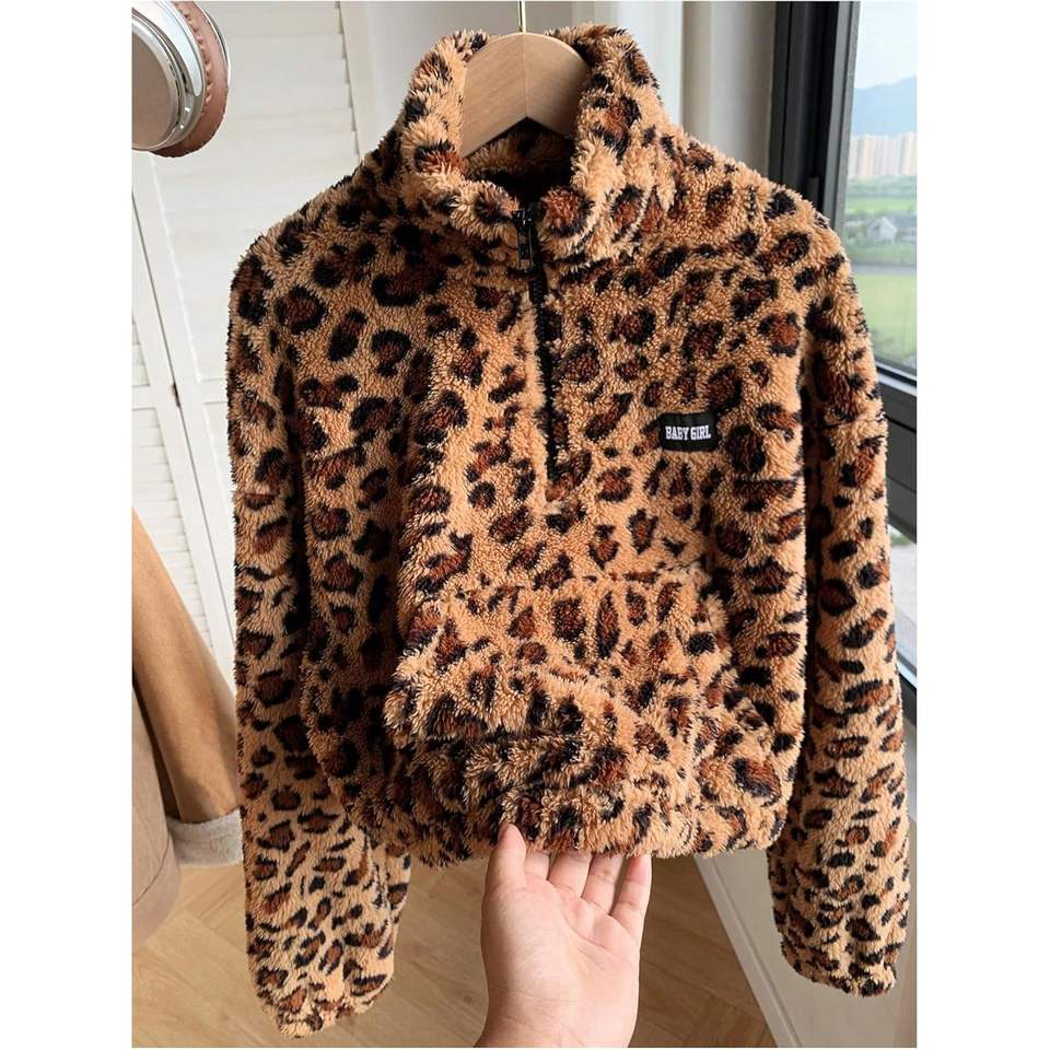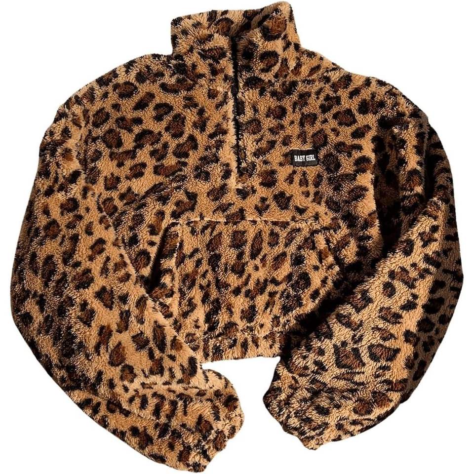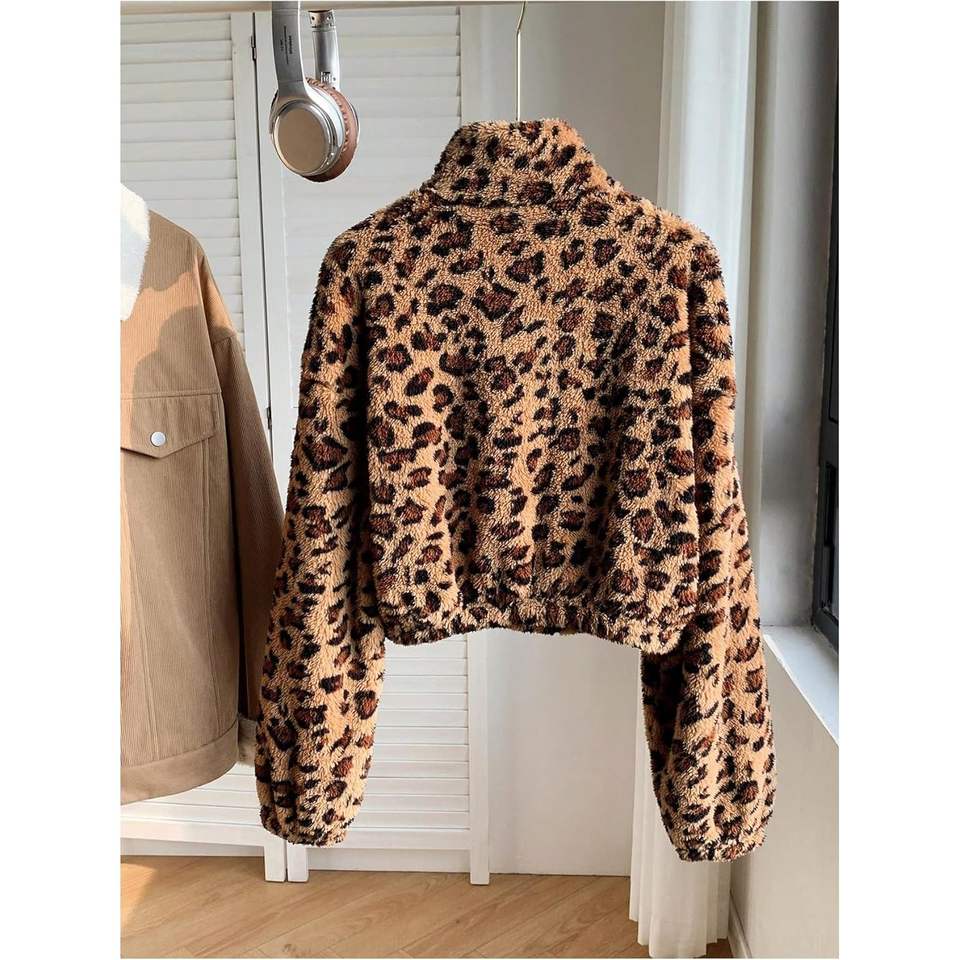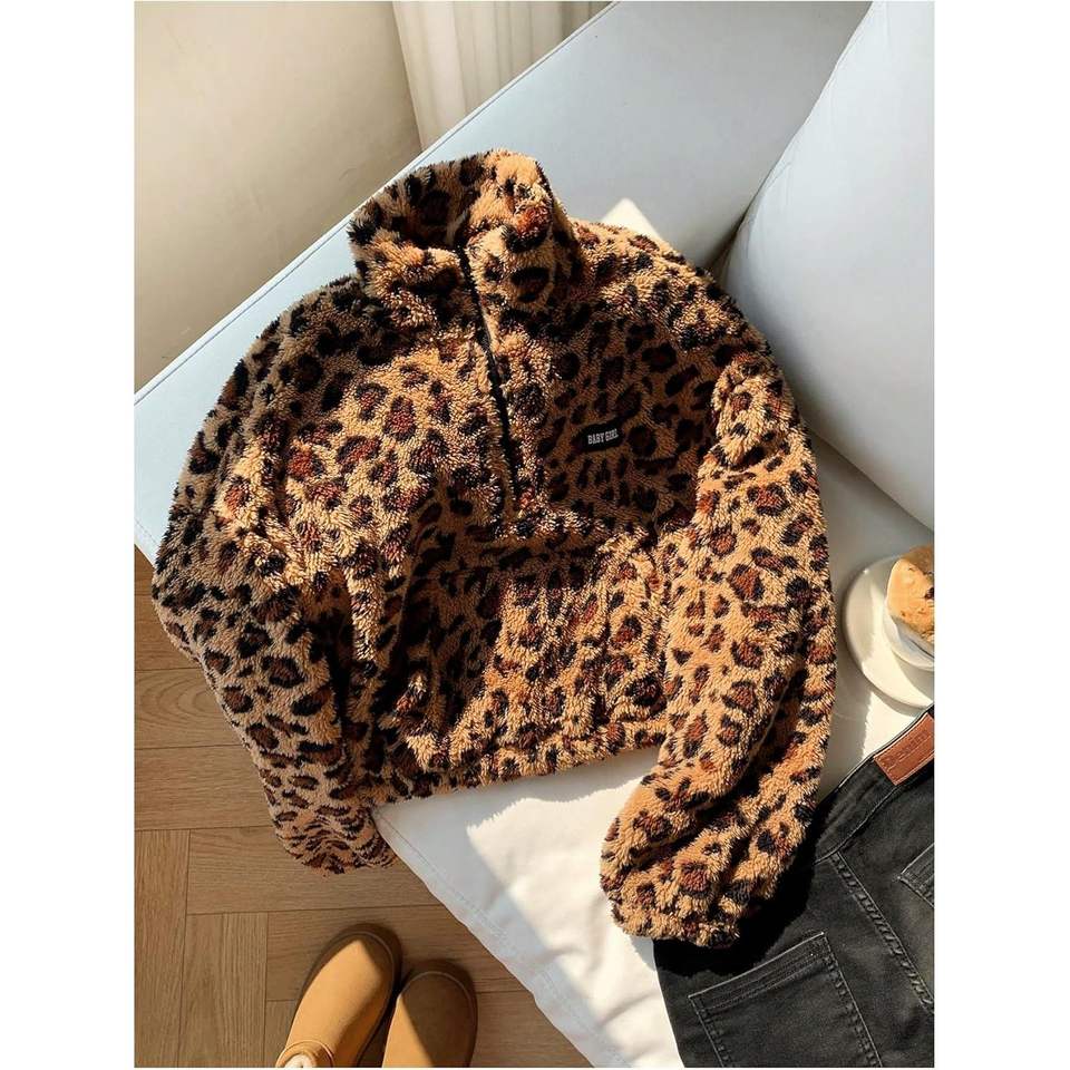 Sweat-shirt personnalisé pour femme en polaire motif léopard, col montant semi-zippé, manches longues, coupe courte, avec poche, anti-boulochage, effet duveteux
