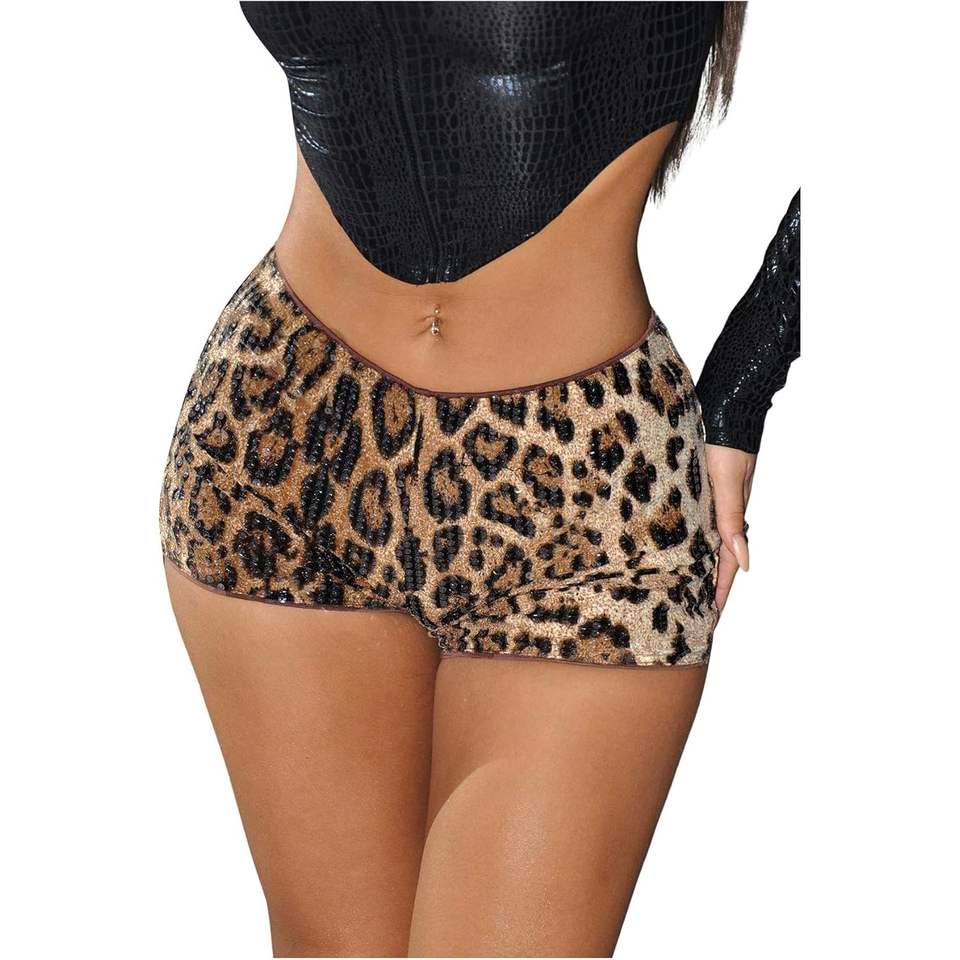 Mini-short léopard à sequins pour femme, taille basse, coupe moulante, tenue de club scintillante, style rave