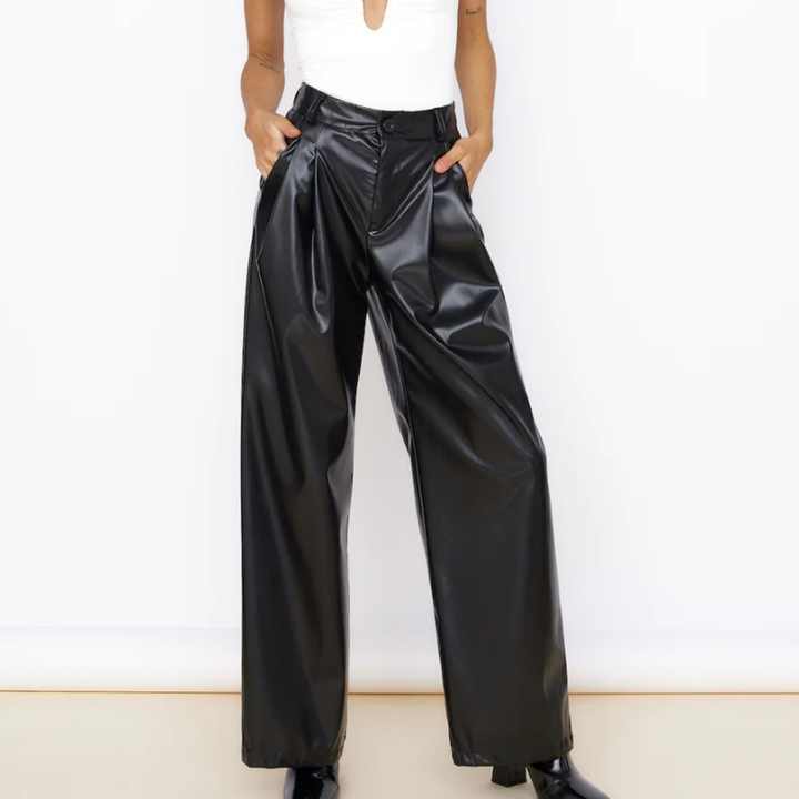Pantalon en similicuir PU pour femme, coupe droite ample, couleur unie, avec boutons, style mode, jambe large