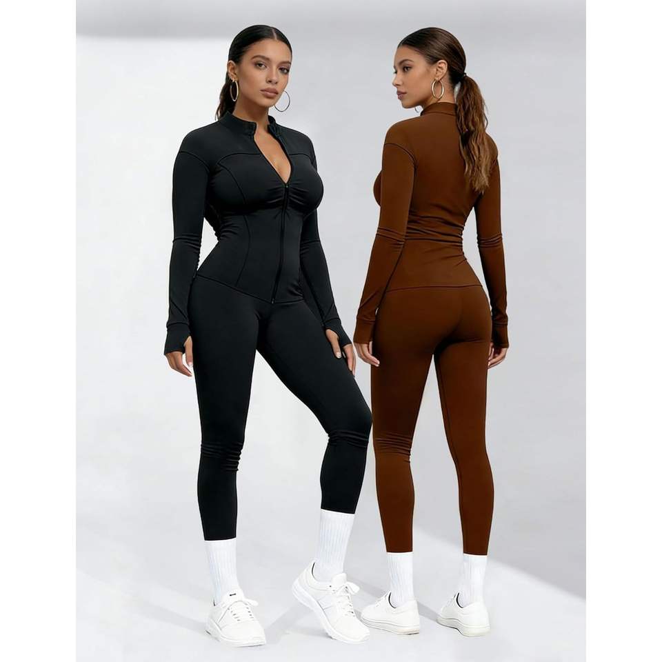 Ensemble de yoga personnalisé pour femmes, 2 pièces, veste à fermeture éclair à manches longues et leggings moulants, tissu extensible en spandex et polyester, tenue de sport