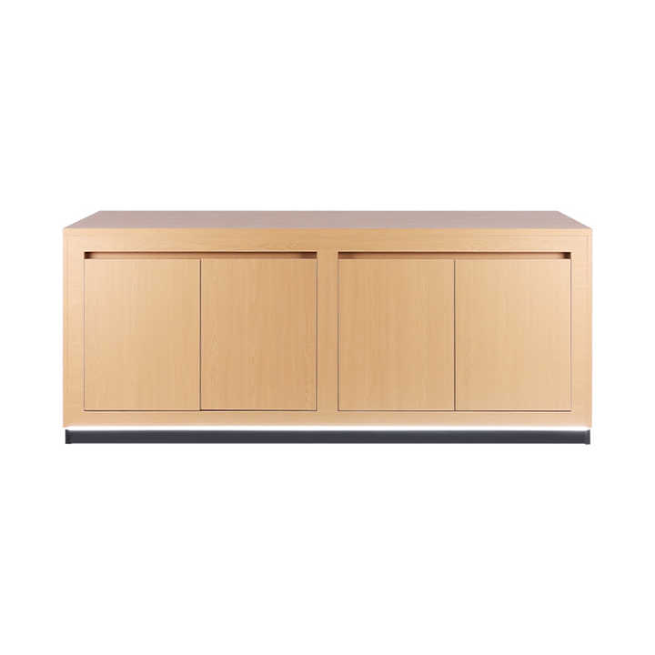 Verre trempé, acier inoxydable, MDF, lumière LED, acrylique