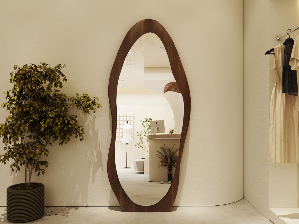 Miroir mural de décoration intérieure pour chambre à coucher, design en MDF couleur bois, pleine longueur, sur pied, design ondulé, sans cadre, en verre