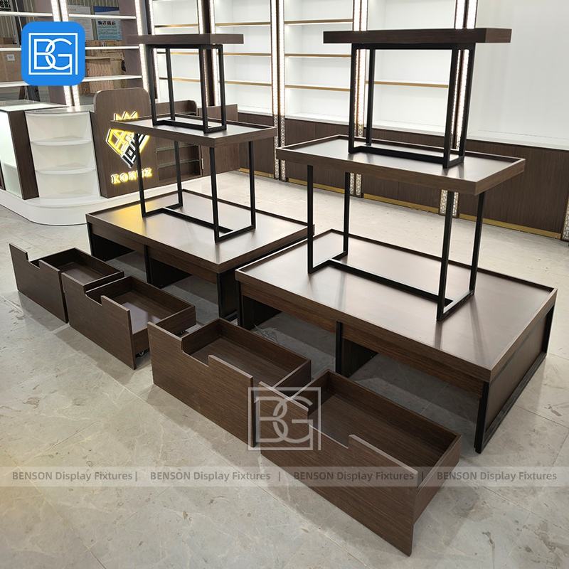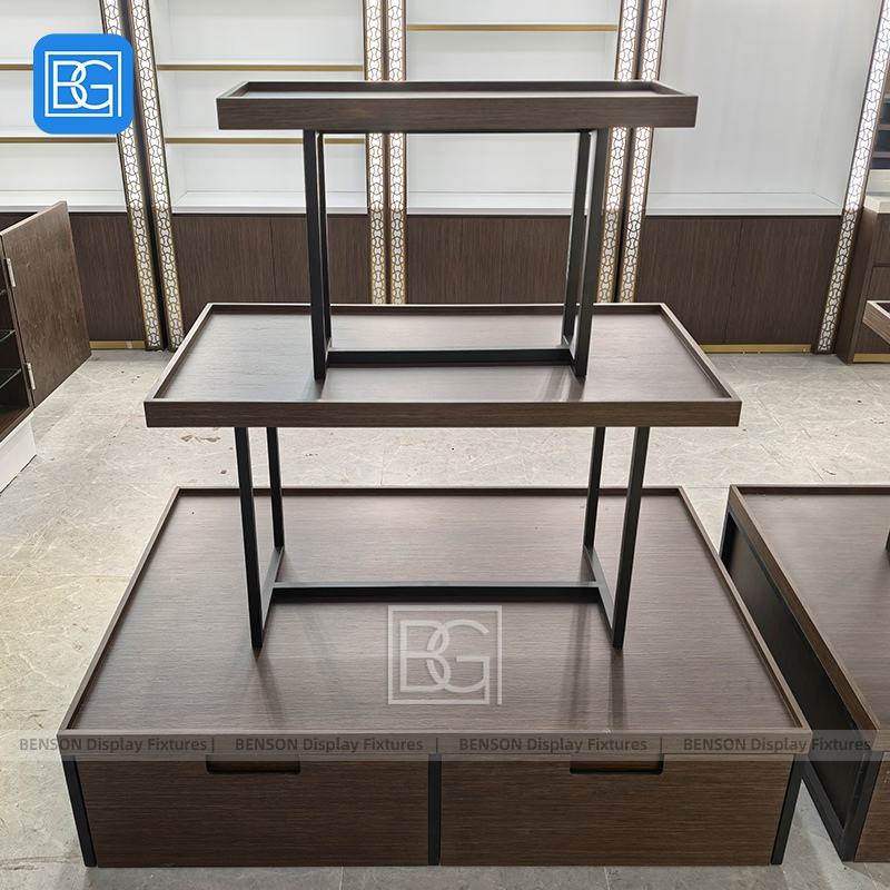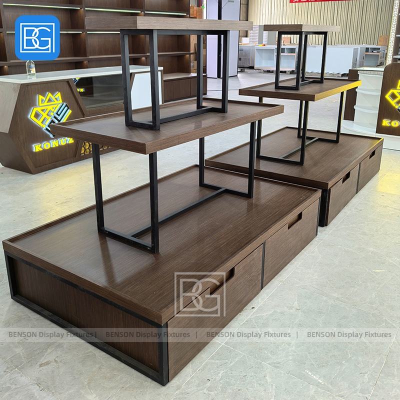 Étagère de présentation à double niveau en bois sur mesure avec cadre métallique pour îlot central de magasin de détail