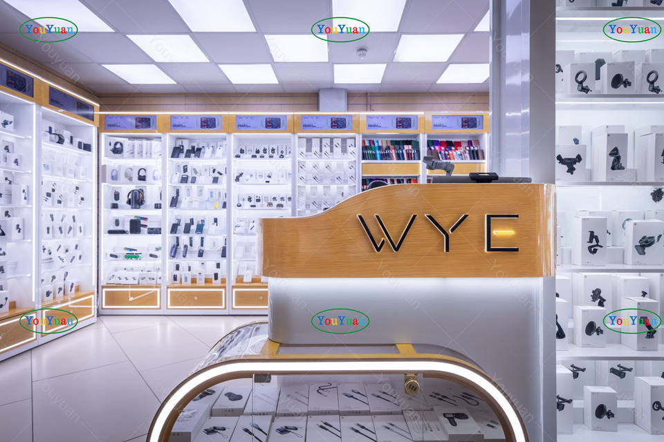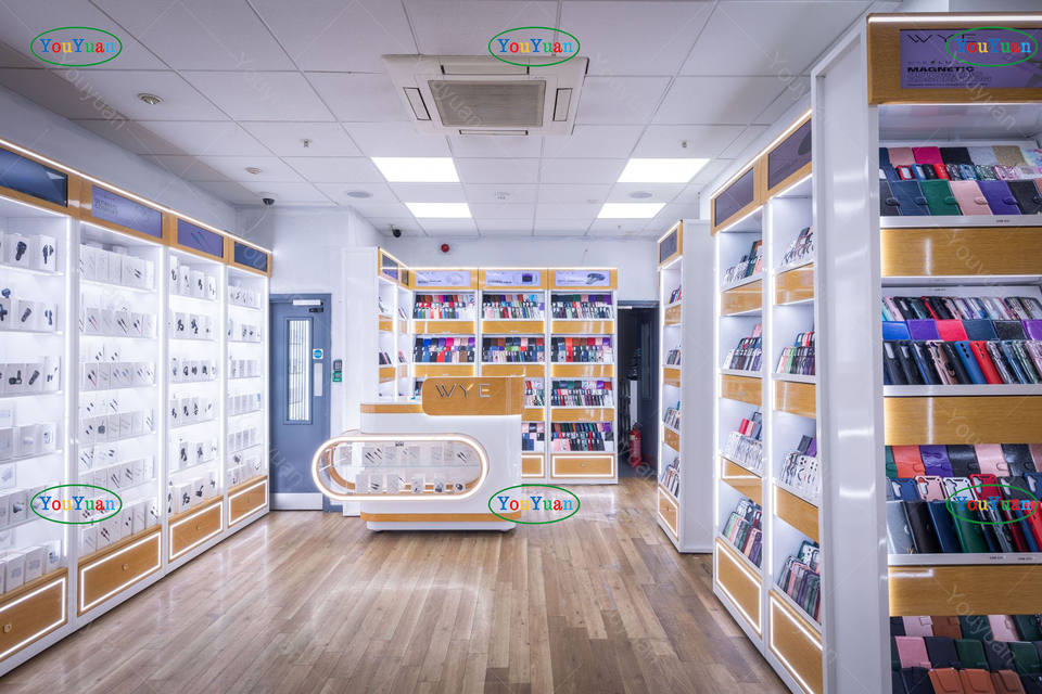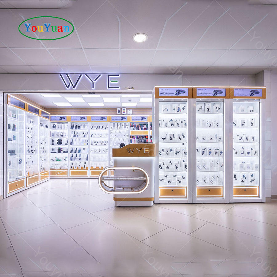 Vitrine en verre à LED en bois personnalisée avec rangement verrouillable au bas et dessus de table pour téléphone intelligent, atelier de réparation et centre commercial