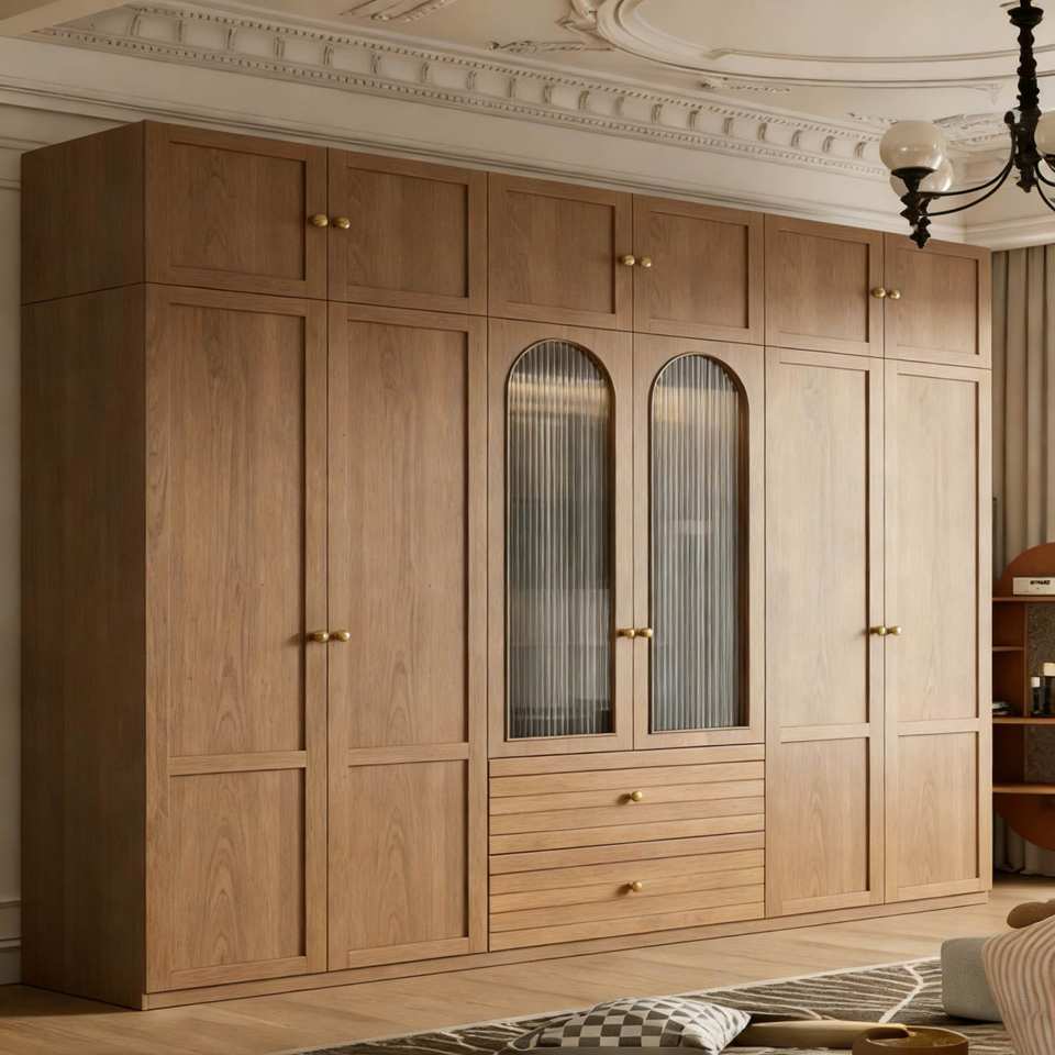Custom Wooden Wardrobe Bedroom Set Classic Panel Design With Arched Glass Doors & Brass Hardware Integrated Storage