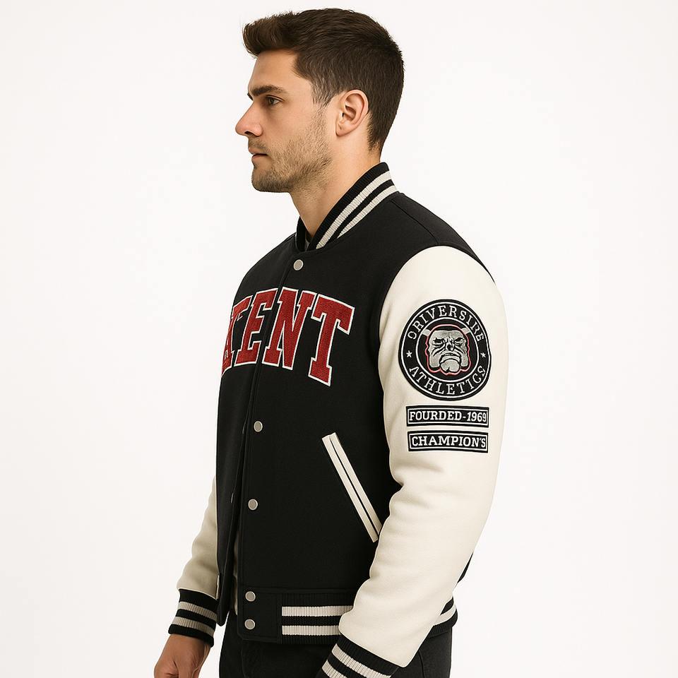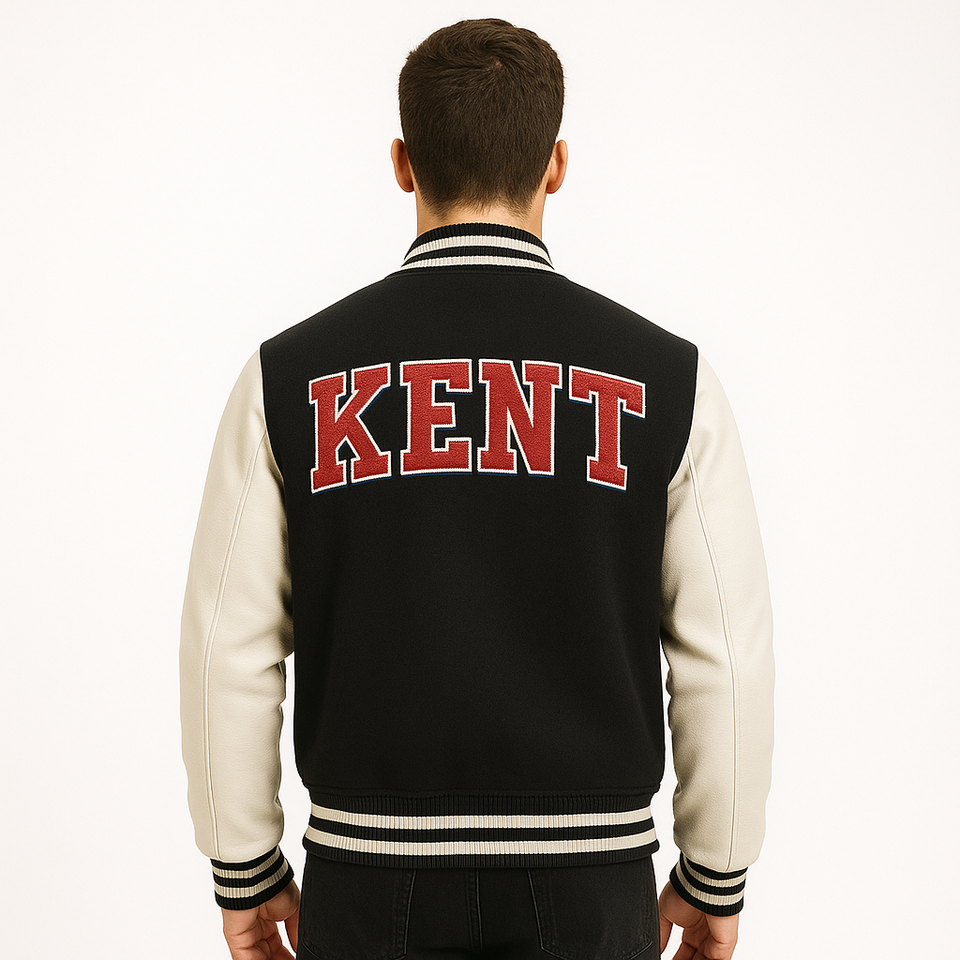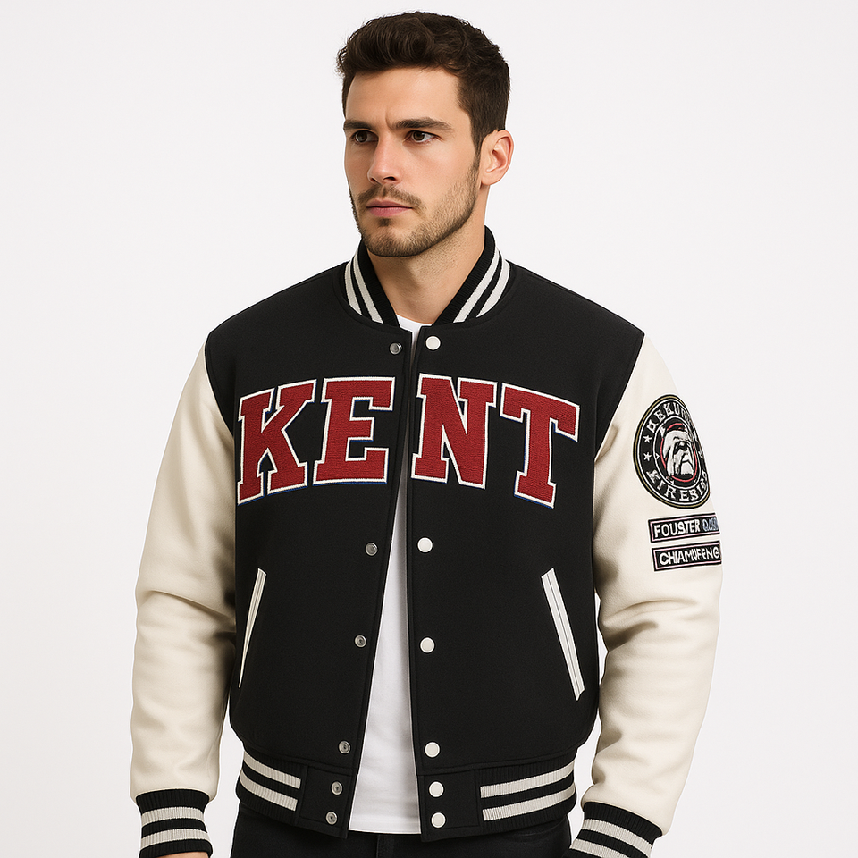 Vestes universitaires en cuir de laine personnalisées pour les écoles et les universités à col montant avec logos et patchs brodés sur le devant Options OEM