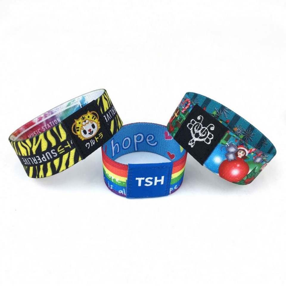 Bracelet en tissu élastique personnalisé avec étiquette tissée et design par sublimation, en polyester élastique, pour événements publicitaires