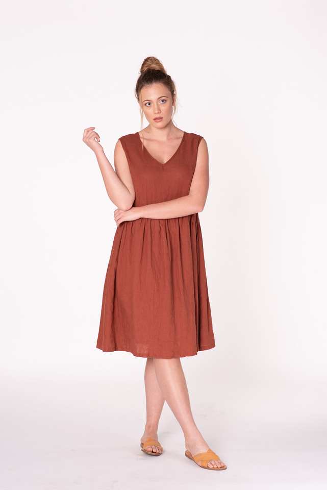 Robe mi-longue col en V en lin tissé personnalisé Écologique Demoiselle d'honneur d'été à volants sans manches Poches naturelles teint en plaine