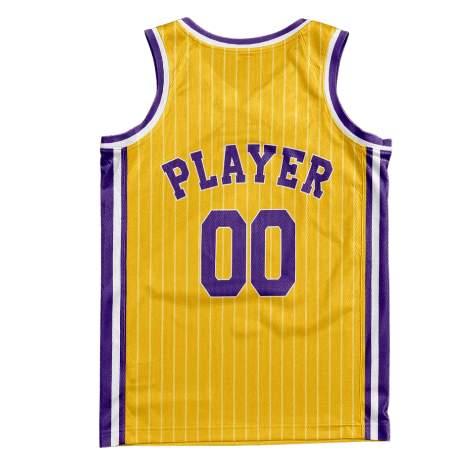 Ensemble uniforme de basketball rétro personnalisé jaune à rayures fines, maillot et short avec bordure de col blanc et violet, design d'équipe rétro