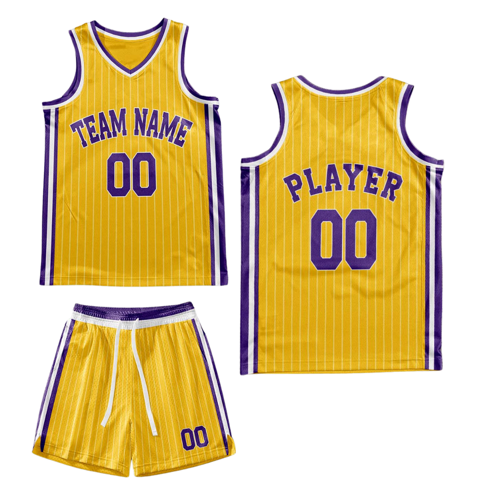 Ensemble uniforme de basketball rétro personnalisé jaune à rayures fines, maillot et short avec bordure de col blanc et violet, design d'équipe rétro