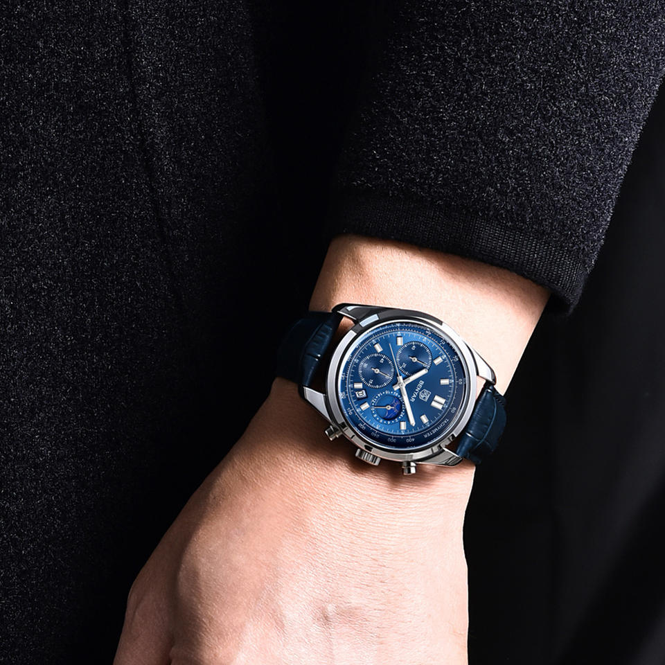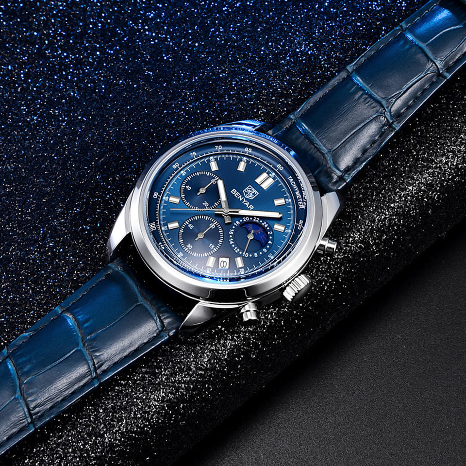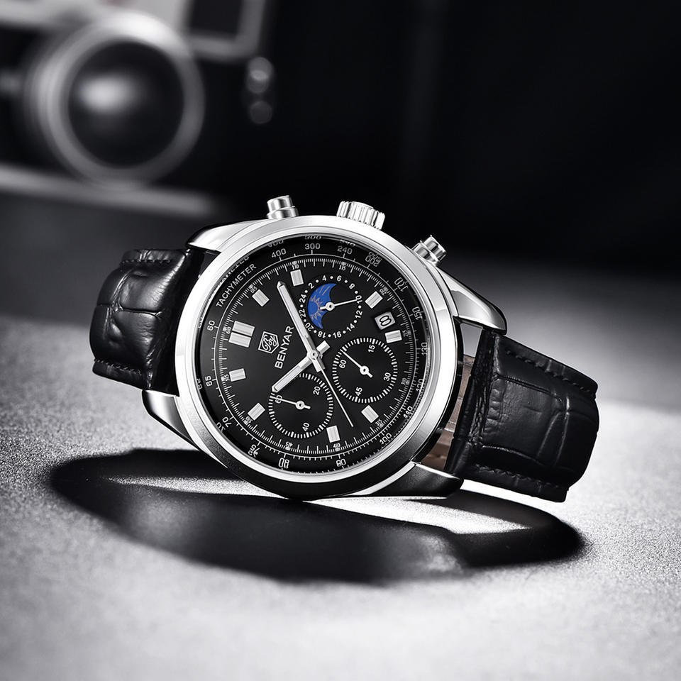 Montre personnalisée avec votre propre logo BENYAR 5193, nouvelle montre pour homme, phase lunaire, multifonctionnelle, cadran à trois aiguilles, montre à quartz pour homme, style décontracté