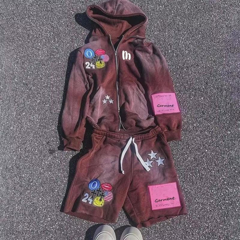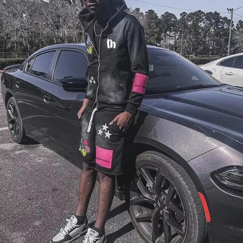 Ensemble personnalisé veste zippée et short, survêtements vintage délavés à l'acide avec fermeture éclair, sweat à capuche zippé et short de jogging ornés de strass, ensembles pour hommes
