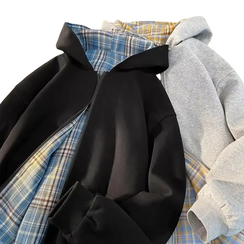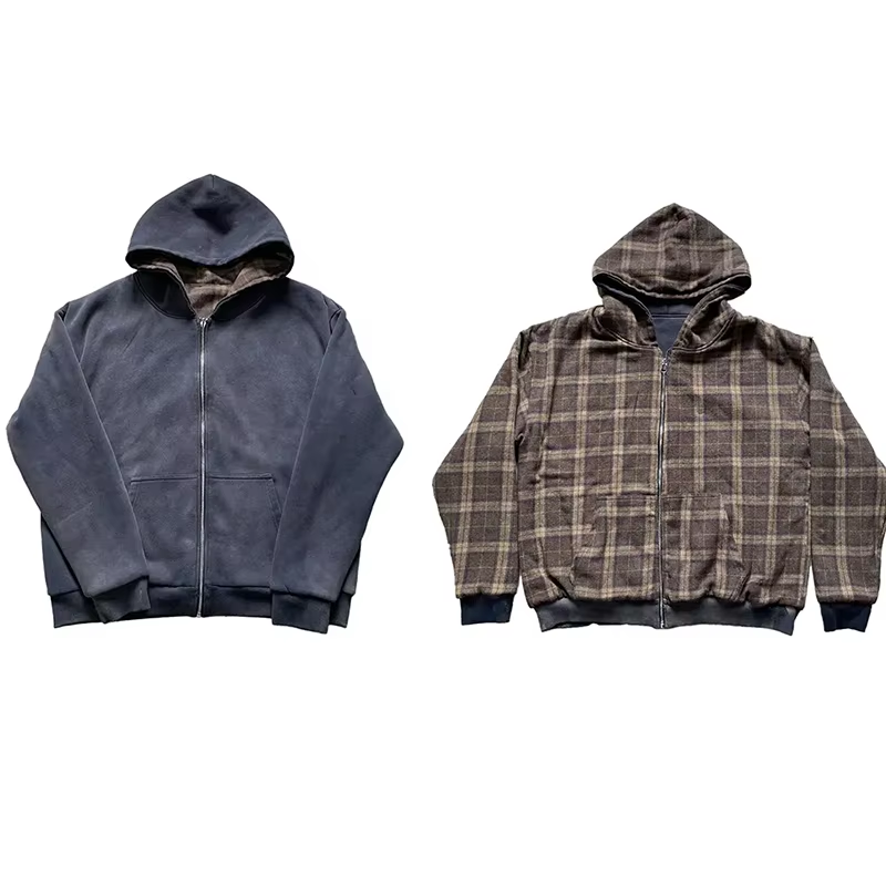 Custom Zipper Plaid Jacket Men Boxy Heavyweight Striped Double Layer Reversible Flannel Hoodie