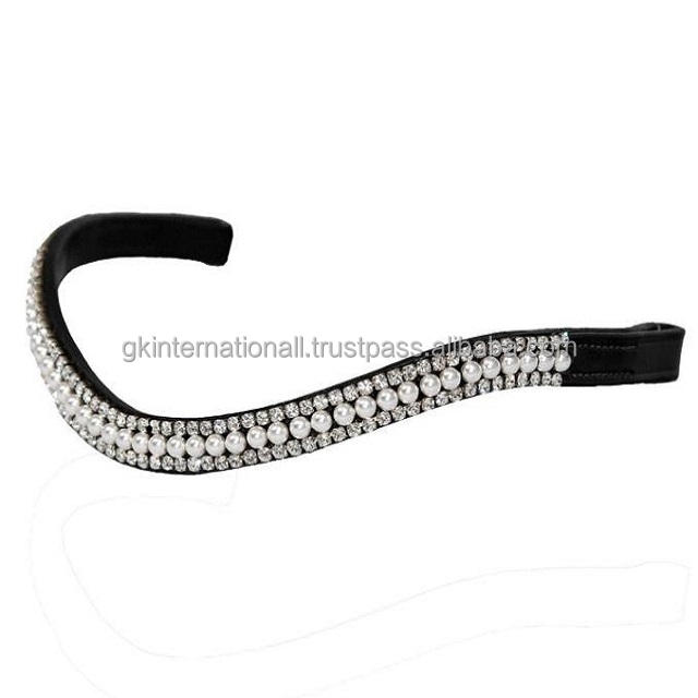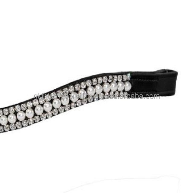 Conception personnalisée perle blanche avec des cristaux clairs méga bling chaîne forme de vague à la main en cuir cheval front bande en plein épi sur