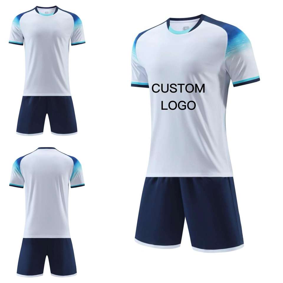 Custom football kit mens breathable quick dry white navy jersey and shorts set with gradient sleeves training uniform