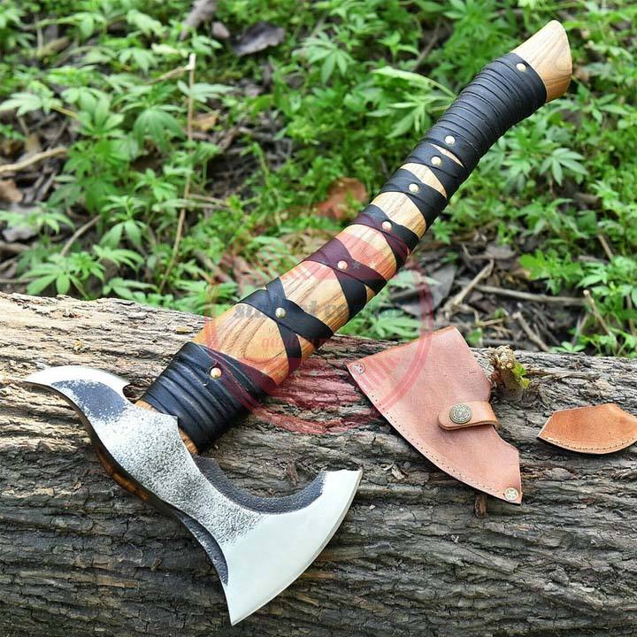 Hache faite à la main sur mesure en acier à haute teneur en carbone avec manche en bois et gaine en cuir