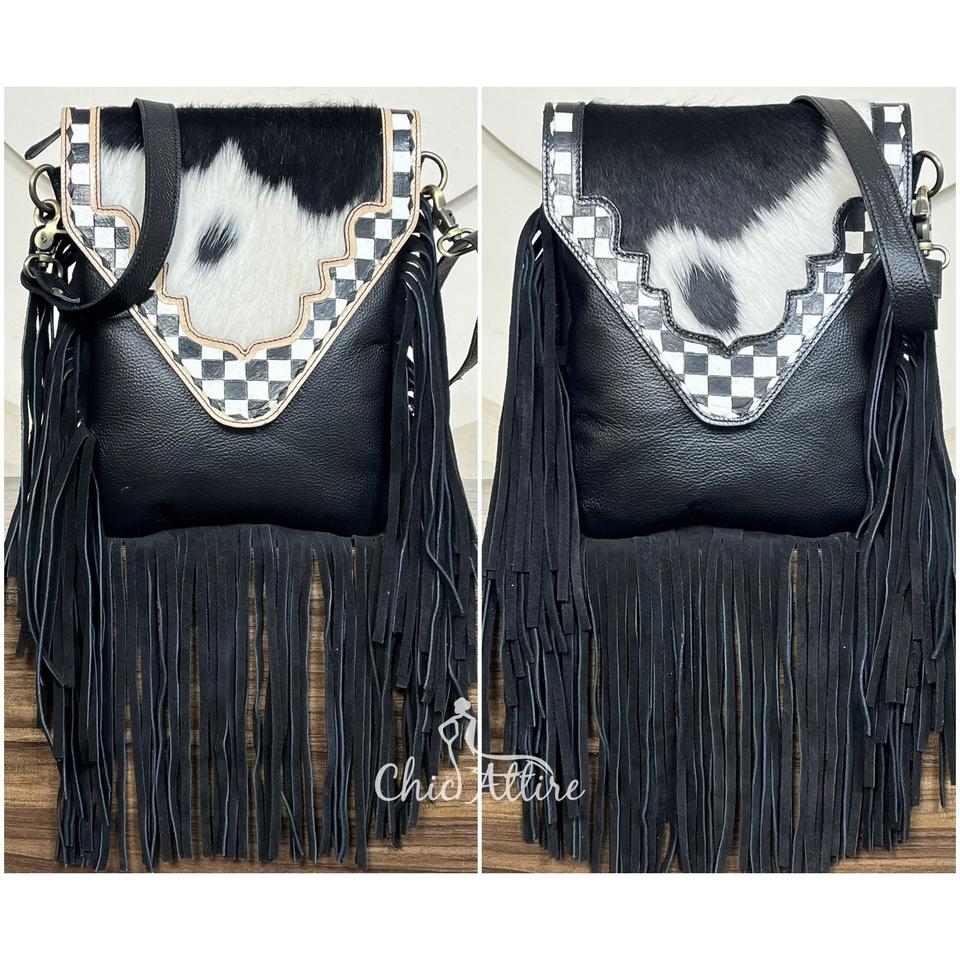 Sac bandoulière à franges en cuir à carreaux travaillé à la main