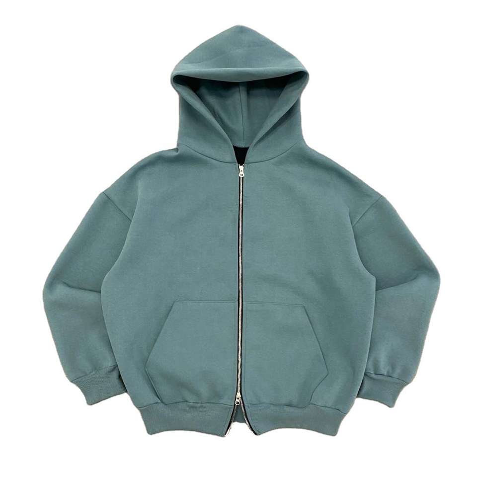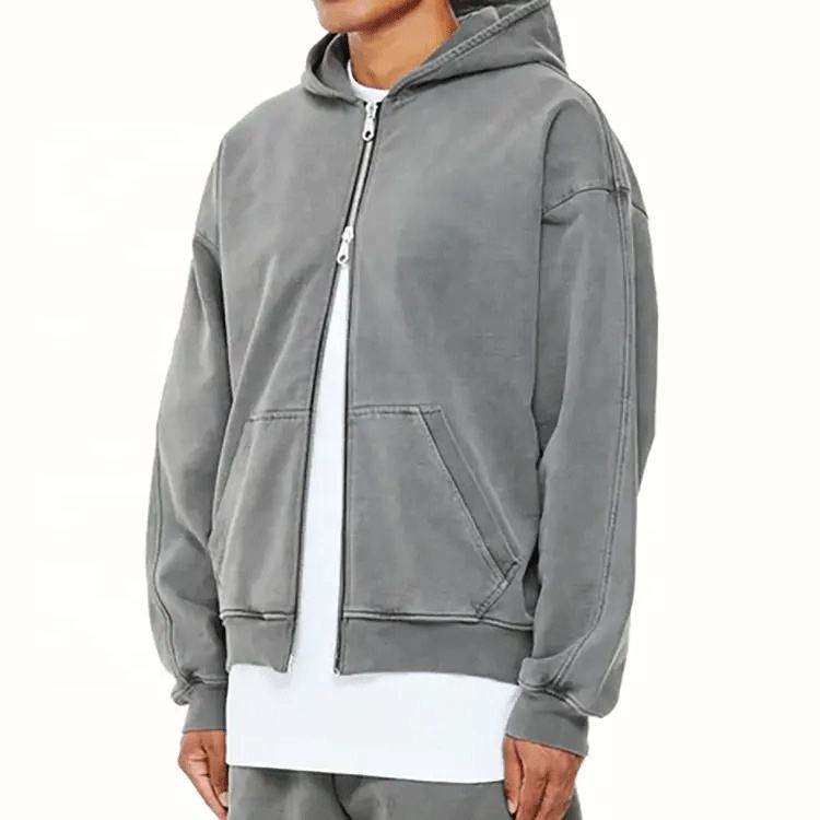 Sweat à capuche zippé personnalisé avec logo brodé, style streetwear, 100% coton, anti-rétrécissement, délavé à l'acide, gris, pour homme
