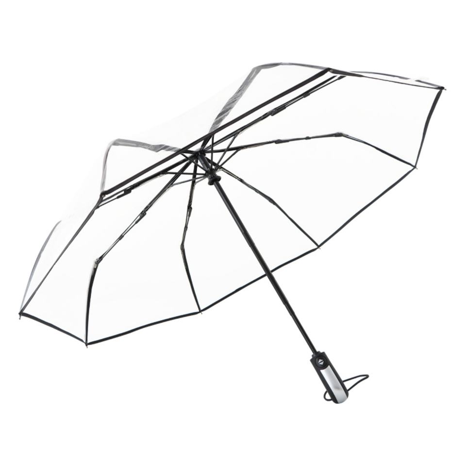 Parapluie de voyage compact et transparent, entièrement automatique, 27 pouces, résistant à la pluie et au vent, pliable en 3 sections, avec logo personnalisé