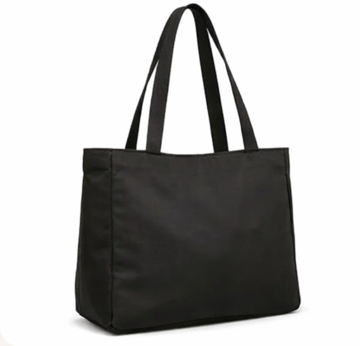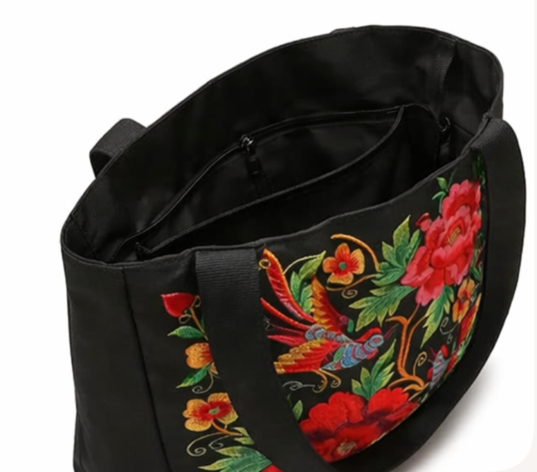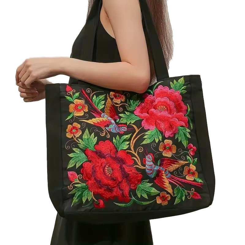 Sac fourre-tout à bandoulière tendance en toile de coton noir, grande capacité, avec logo personnalisé et broderie florale, idéal pour la plage et le shopping