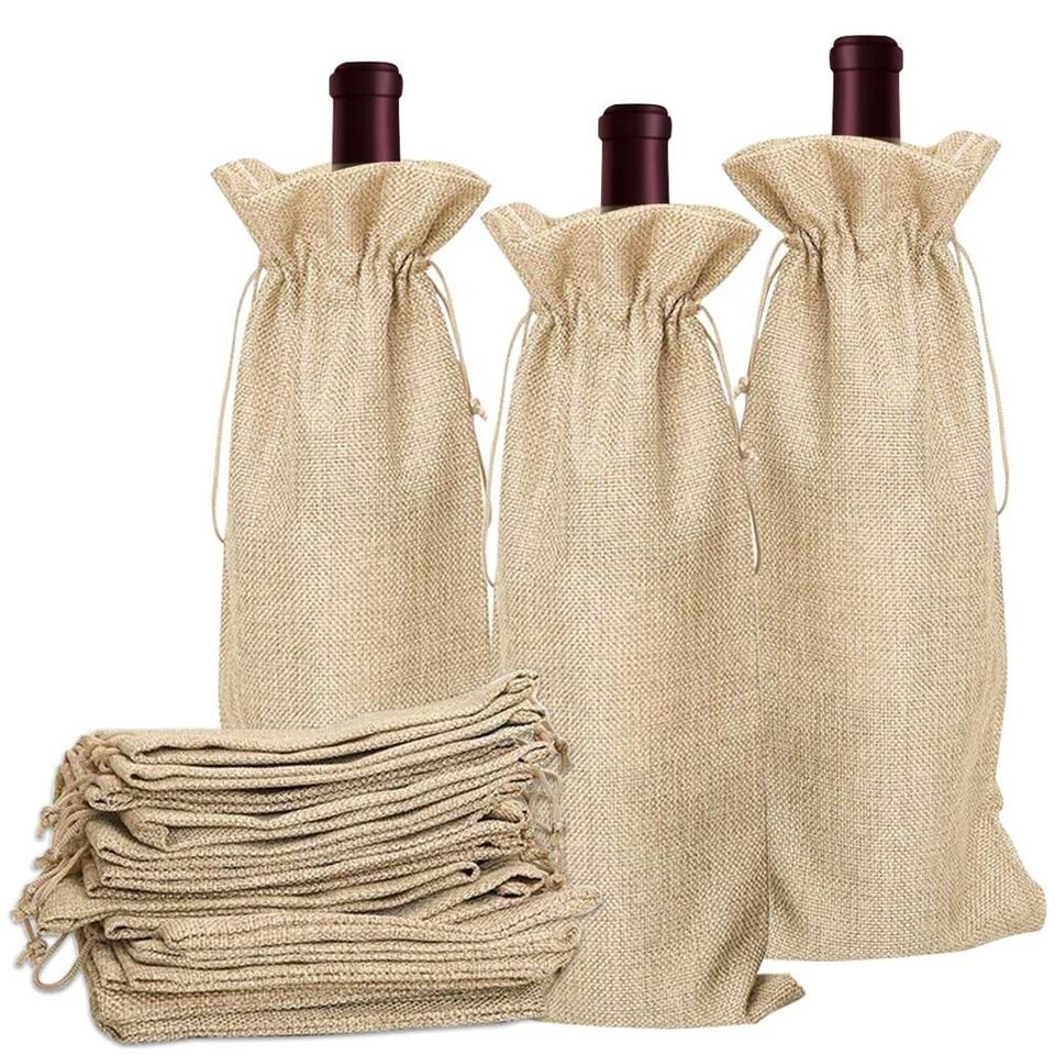Vente en gros de sacs à cordon en toile de jute avec logo personnalisé Emballage de cadeau de fête de mariage en jute uni pour le vin en stock