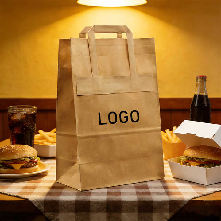 Sac en papier kraft brun imprimé avec logo personnalisé, emballage à emporter pour la restauration rapide, sac en papier kraft