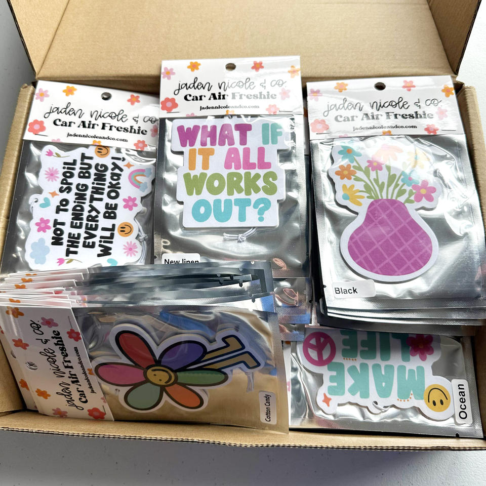 Désodorisant de voiture personnalisé, liquide, en papier imprimé par un designer.