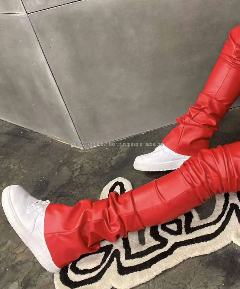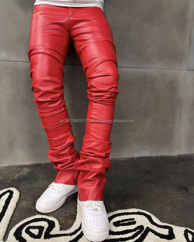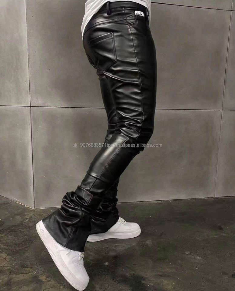 Pantalon de survêtement personnalisé avec logo, coupe slim empilée, en similicuir PU, style motard streetwear, pantalon évasé en similicuir pour homme