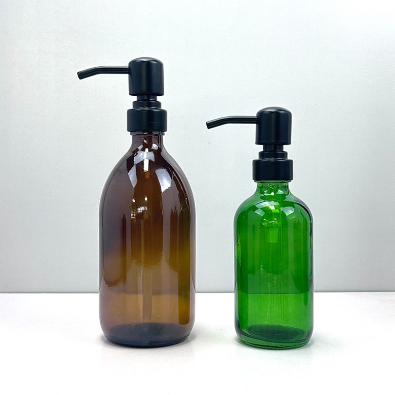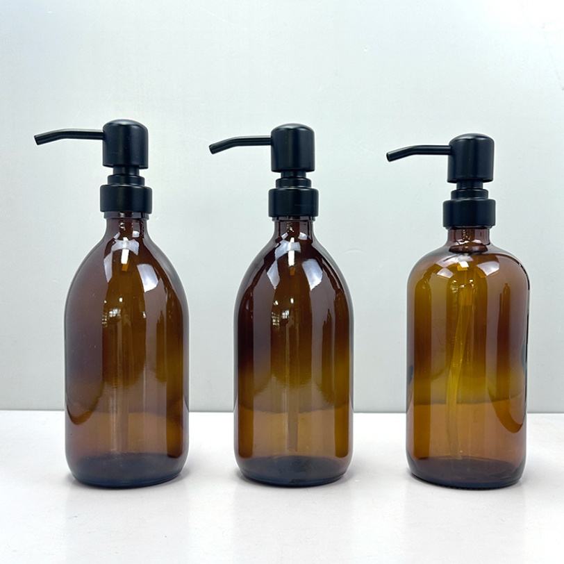 Distributeur de savon liquide en verre ambré avec logo personnalisé, vente en gros, bouteille en verre de 500 ml avec pompe en acier inoxydable 304 noir mat