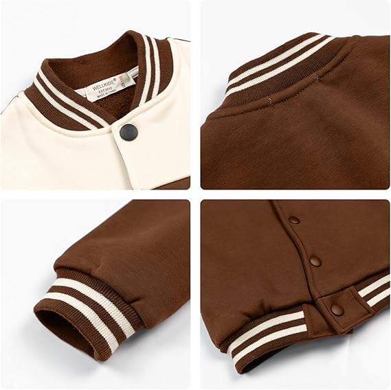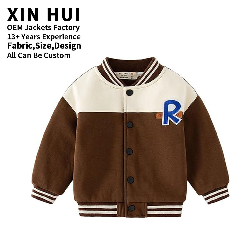 Veste de baseball pour homme avec logo personnalisé, veste bomber en molleton de coton marron à blocs de couleur, fabrication OEM.