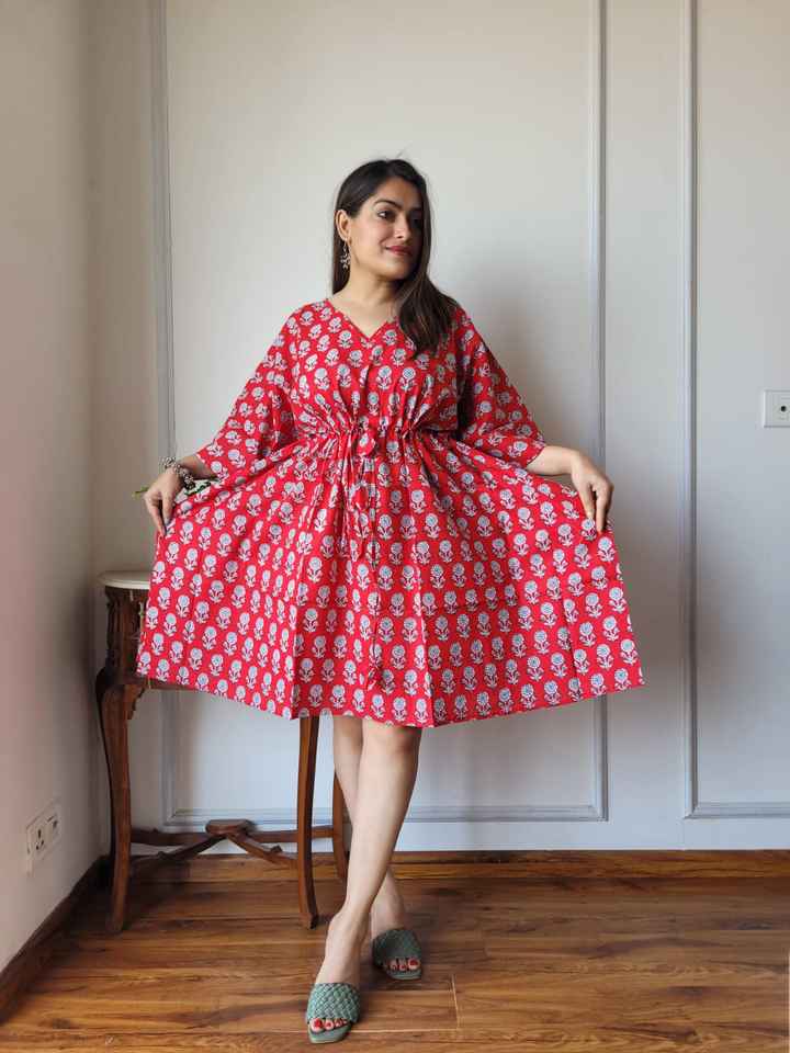 Fait sur mesure écologique lâche naturel été Chic coton imprimé court caftan-v-cou robe avec cravate à la taille réglable