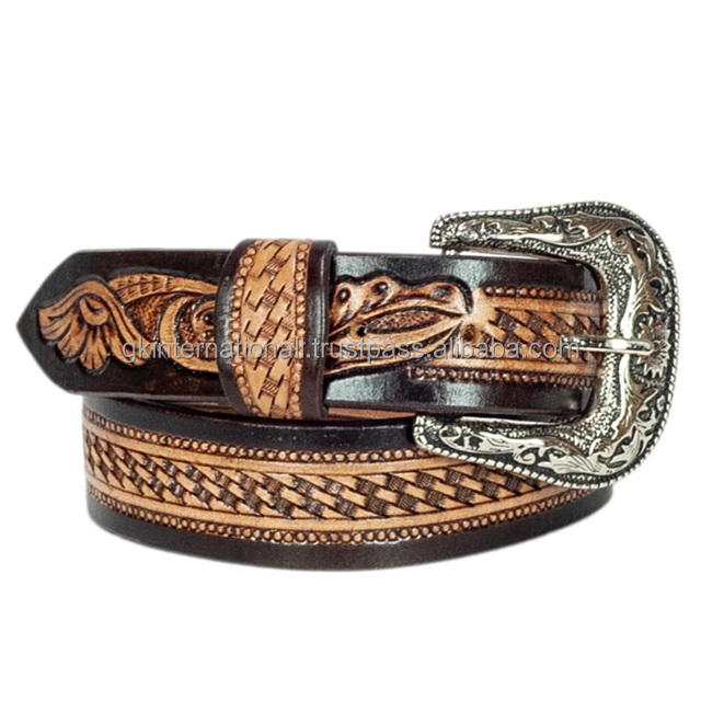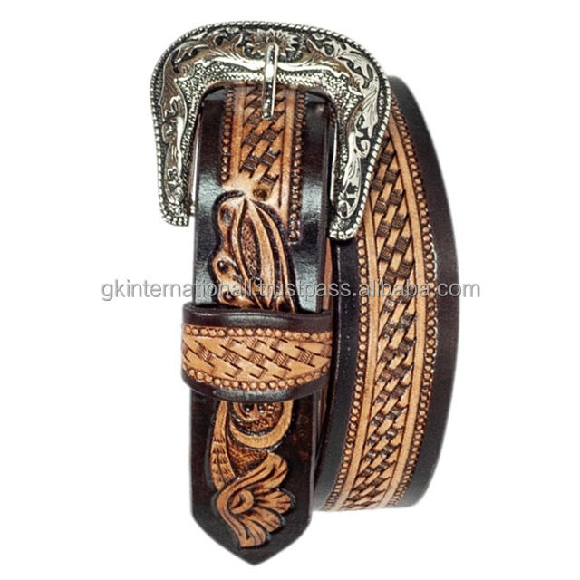 Ceinture en cuir western unisexe, faite sur mesure, à deux tons, avec un motif tressé et floral gravé à la main, et boucle en argent.