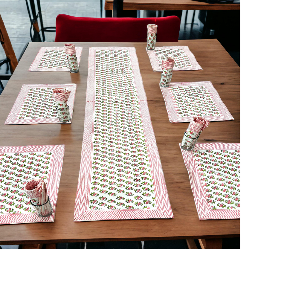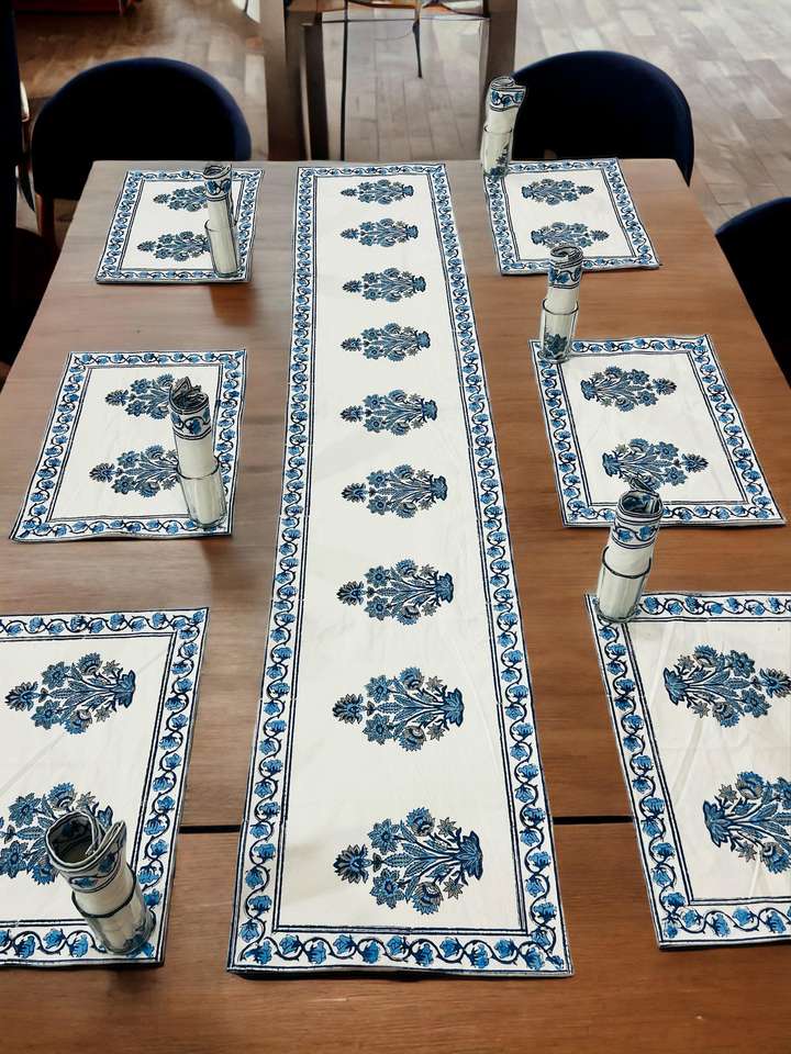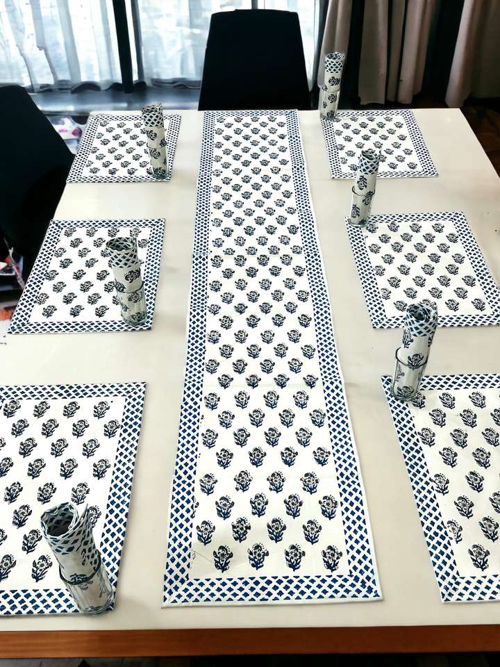 Custom Made in Blue Flower Printed Very Nice Hand Blocked Printed Premium Table Mats with Matching Runners for Home & Hotels