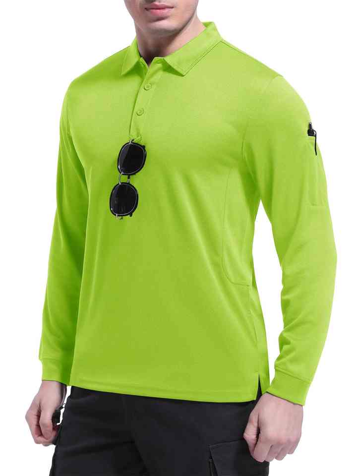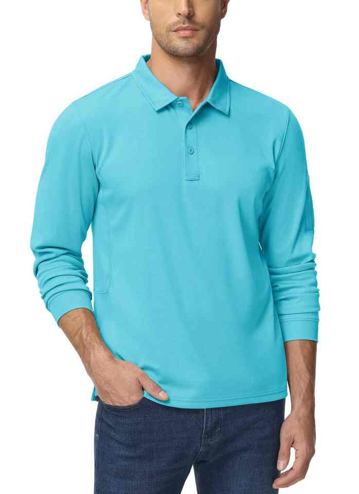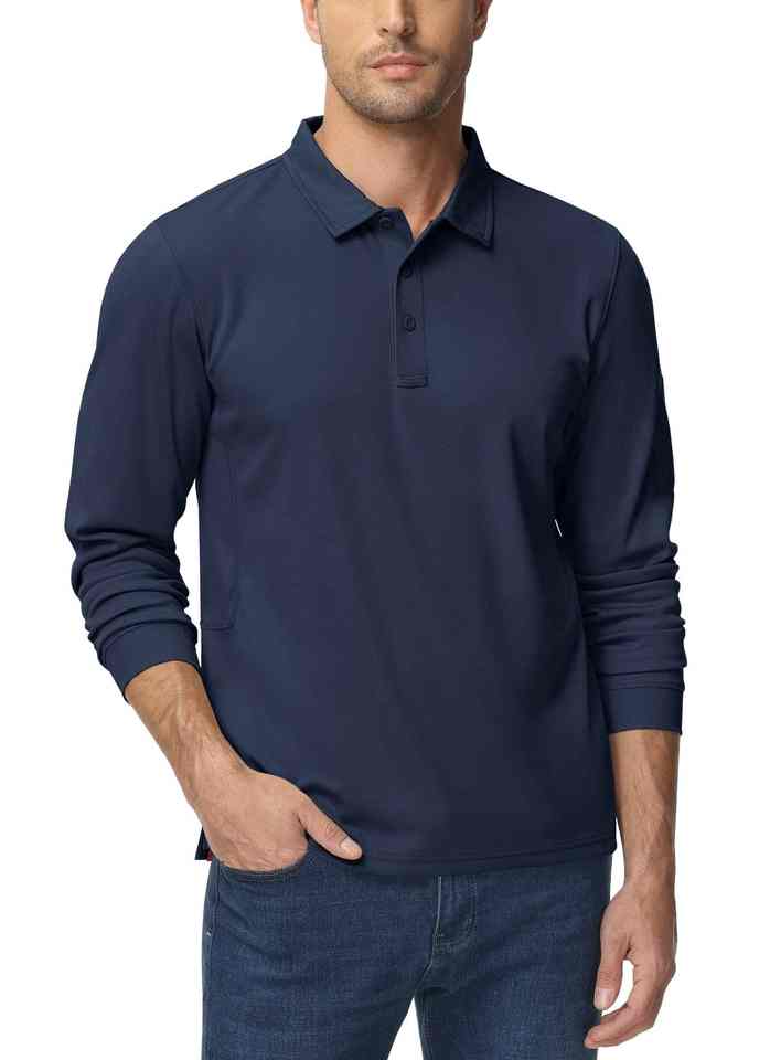 Custom mens long sleeve polo shirt made from durable wrinkle resistant material ideal for travel work and casual style