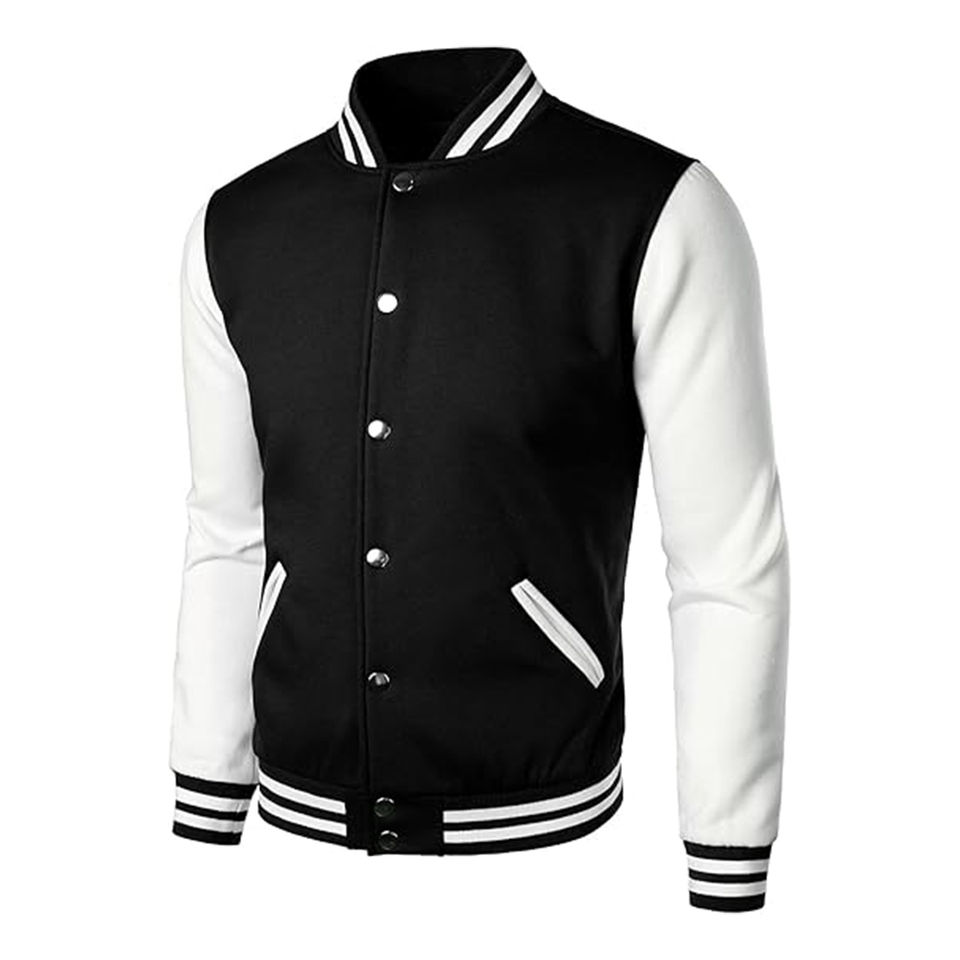 Veste universitaire personnalisée, corps noir, manches blanches, veste de baseball unisexe, col et poignets côtelés rayés, ourlet à boutons-pression