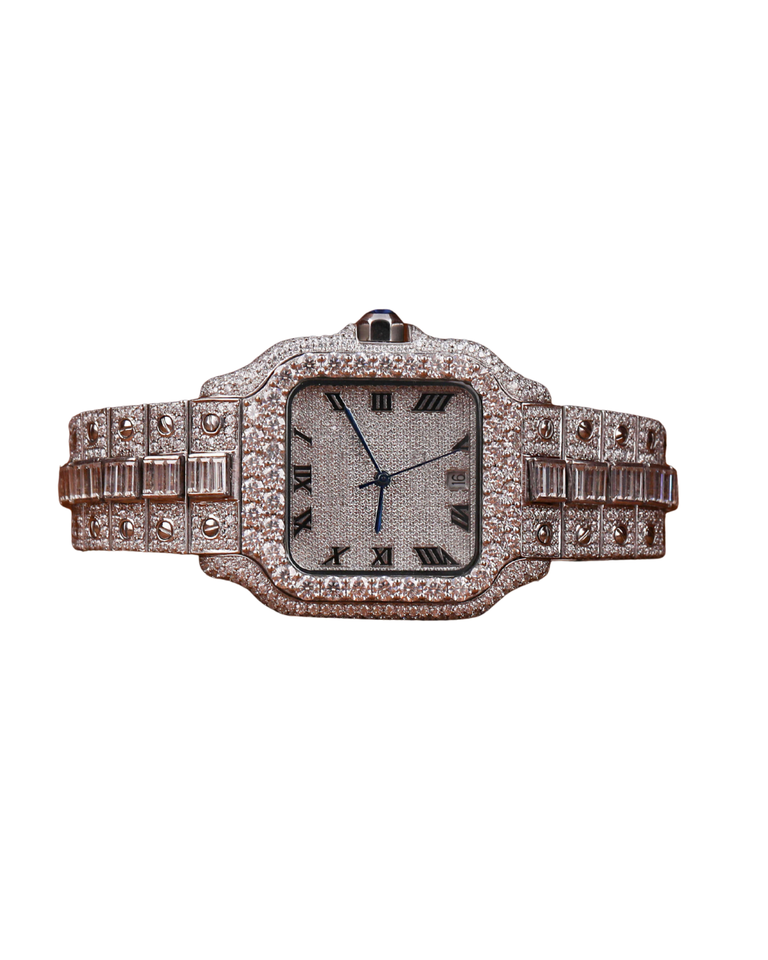 Montre personnalisée en or blanc avec cadran blanc classique, entièrement sertie de diamants Moissanite taille ronde et dateurée.