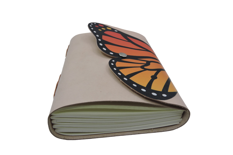 Beau journal papillon monarque en cuir véritable personnalisé avec boutons-pression et papiers blancs à coupe fine