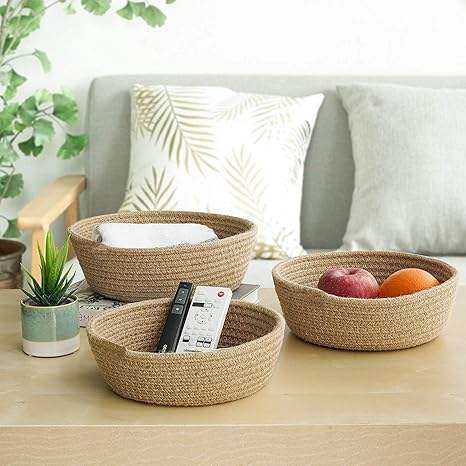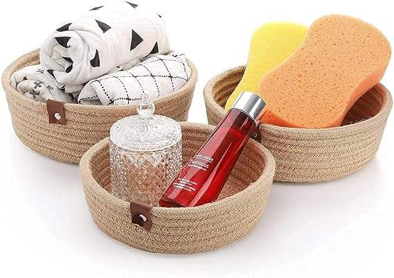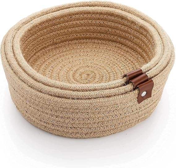Ensemble de 3 paniers de rangement en corde de jute tressée à la main, finition naturelle avec poignées en cuir, pour le rangement et l'organisation