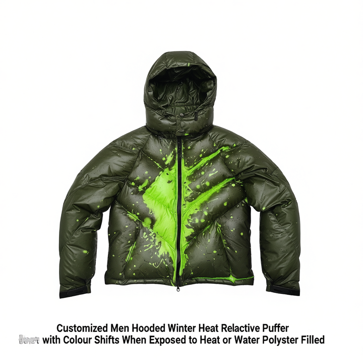 Veste matelassée à capuche pour homme personnalisée, réactive à la chaleur, avec changement de couleur lorsqu'elle est exposée à la chaleur ou à l'eau, rembourrage en polyester
